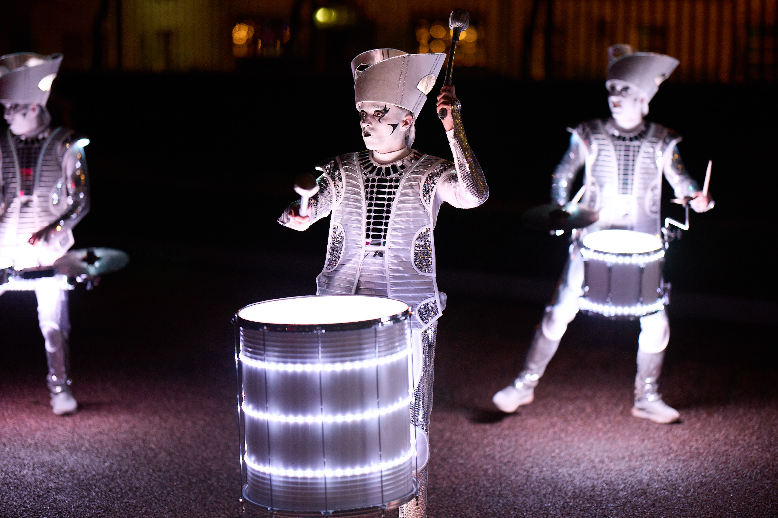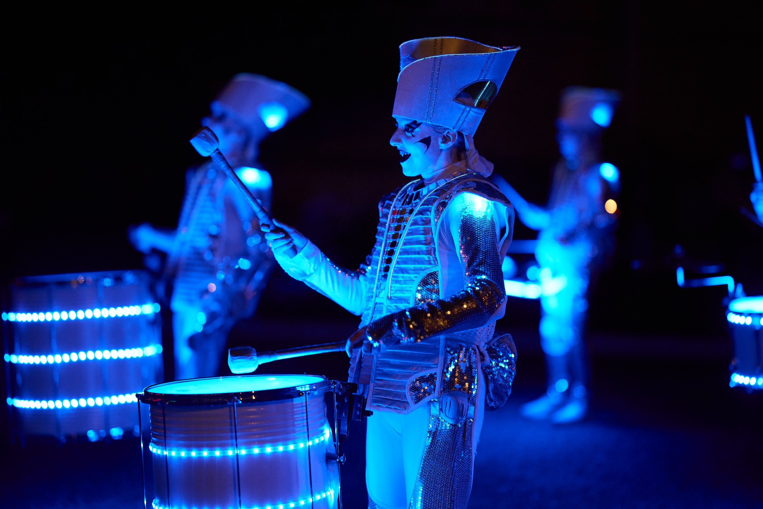 Drummers Unite opened with a performance by Spark! that combined high-impact drumming, dynamic choreography and beautiful lighting design, opening the show and surprising the 400 people gathered in the courtyard by arriving from 5 different points around the building – they entertained and engaged with guests before taking to the stage together for a series of choreographed routines and performances. Joji Hirota and The London Taiko Drummers then dazzled guests by performing a very lively 45 minute set before Spark! returned to close the show.